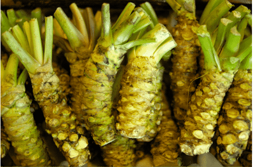 “While a significant portion of the commercial wasabi available today is composed of food coloring and horseradish, traditional Japanese wasabi is derived from Eutrema japonicum, a plant belonging to the Brassicaceae family. The roots or stems of this plant are grated to produce a fine, mustard-like, and pungent paste.”