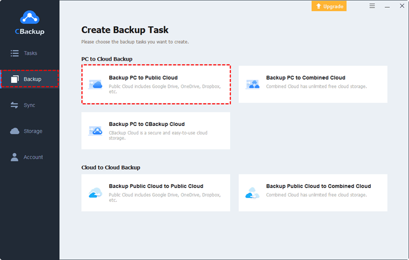This tool comes with various cloud backup functions, and one of its particular features is multiple cloud backups. That is to say, you can backup computer to Google Drive, OneDrive, Dropbox, and multiple public clouds in one place, and backup data to CBackup Cloud, giving 10GB of free space. Other powerful features on CBackup include: